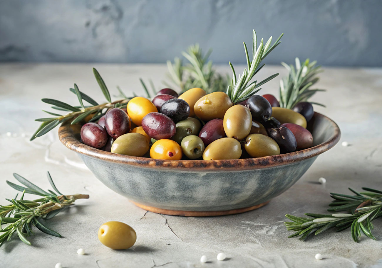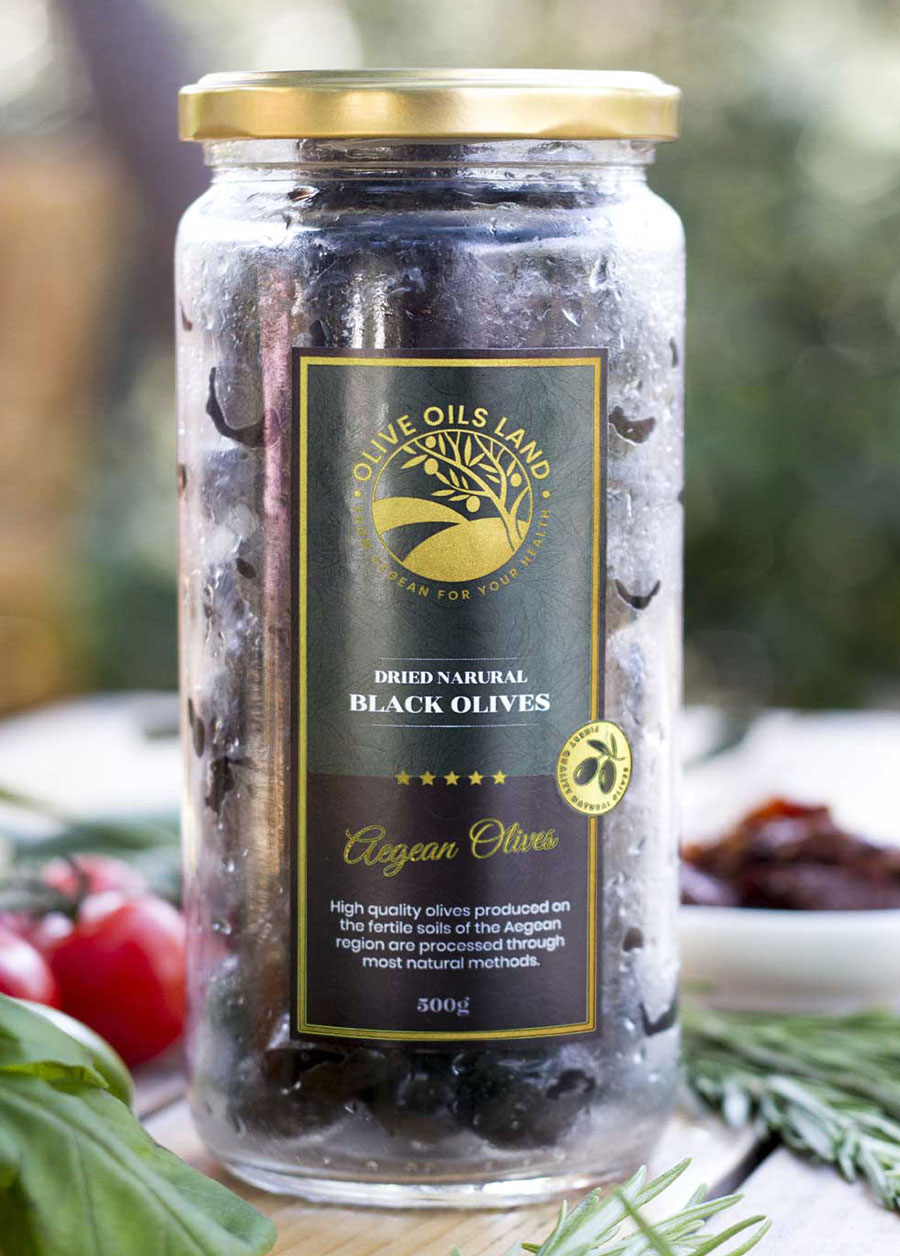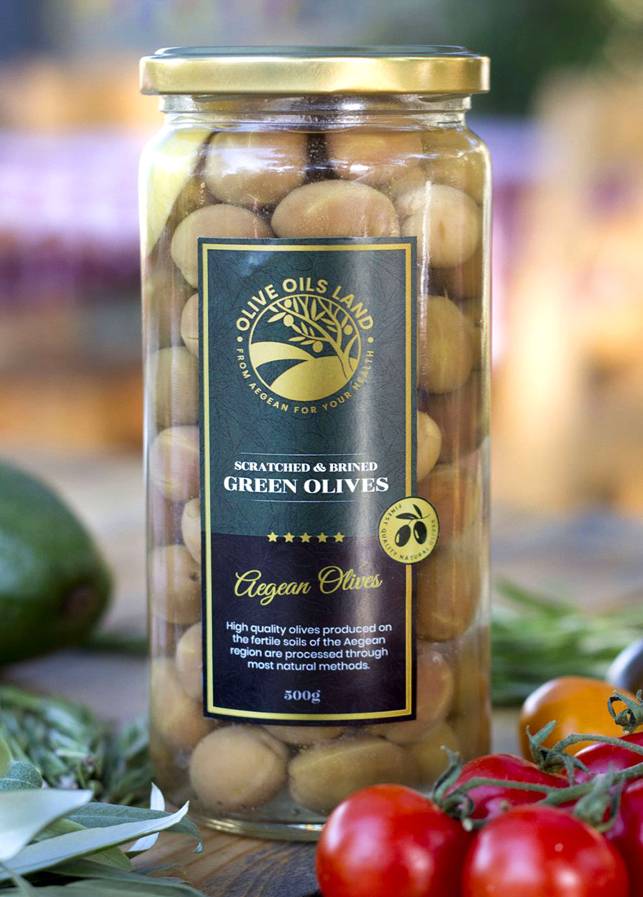 Green olives are carefully treated in a controlled lye solution depending on their size and ripeness, then thoroughly rinsed to remove any residue. They are placed in natural brine prepared with salt and clean water and left to ferment for approximately 12 months, allowing their flavor to fully develop. After fermentation, the olives are rinsed again and packed in glass jars with fresh hot brine. They are stored in cool conditions, and optional additions such as herbs, garlic, or lemon can be included upon request.